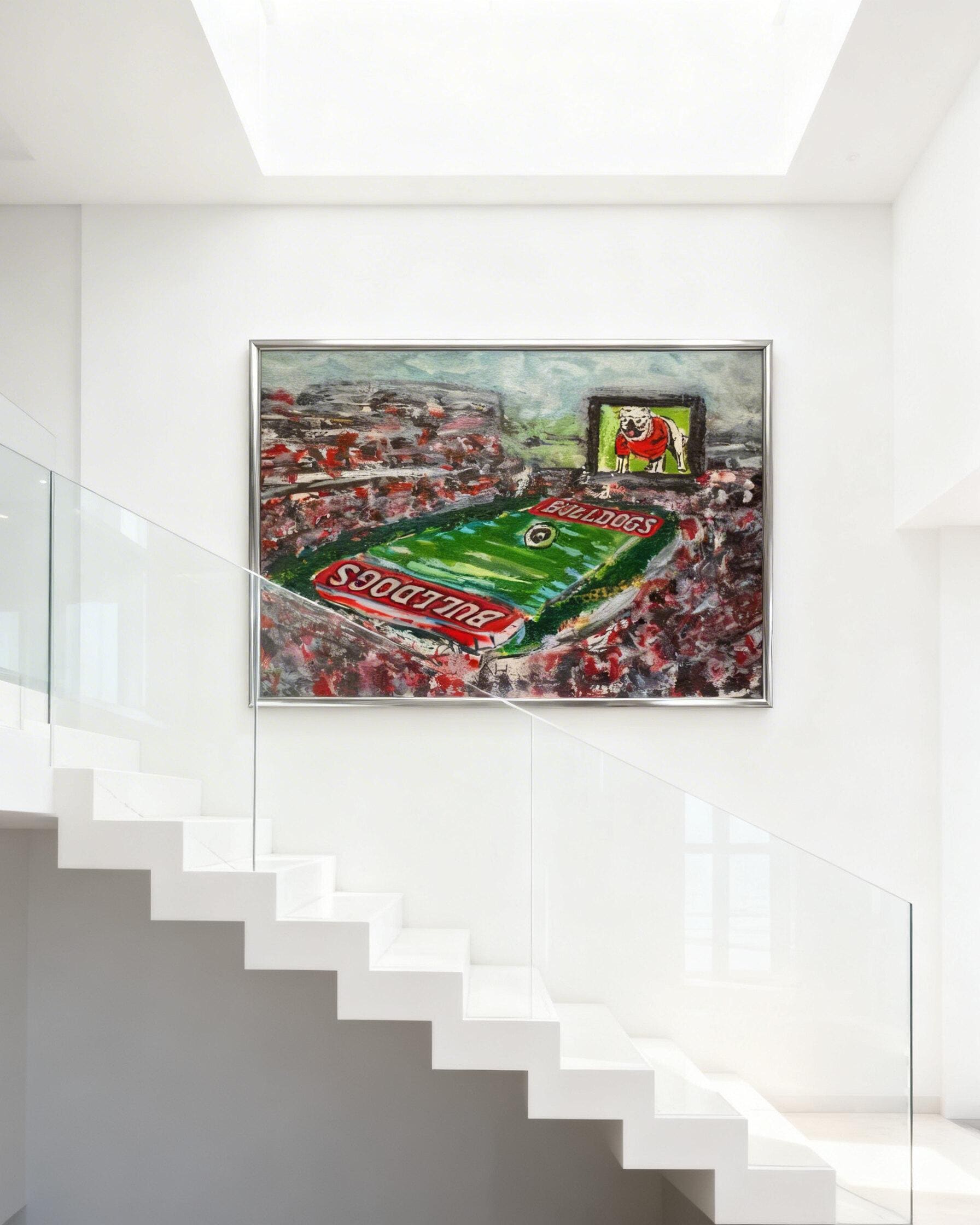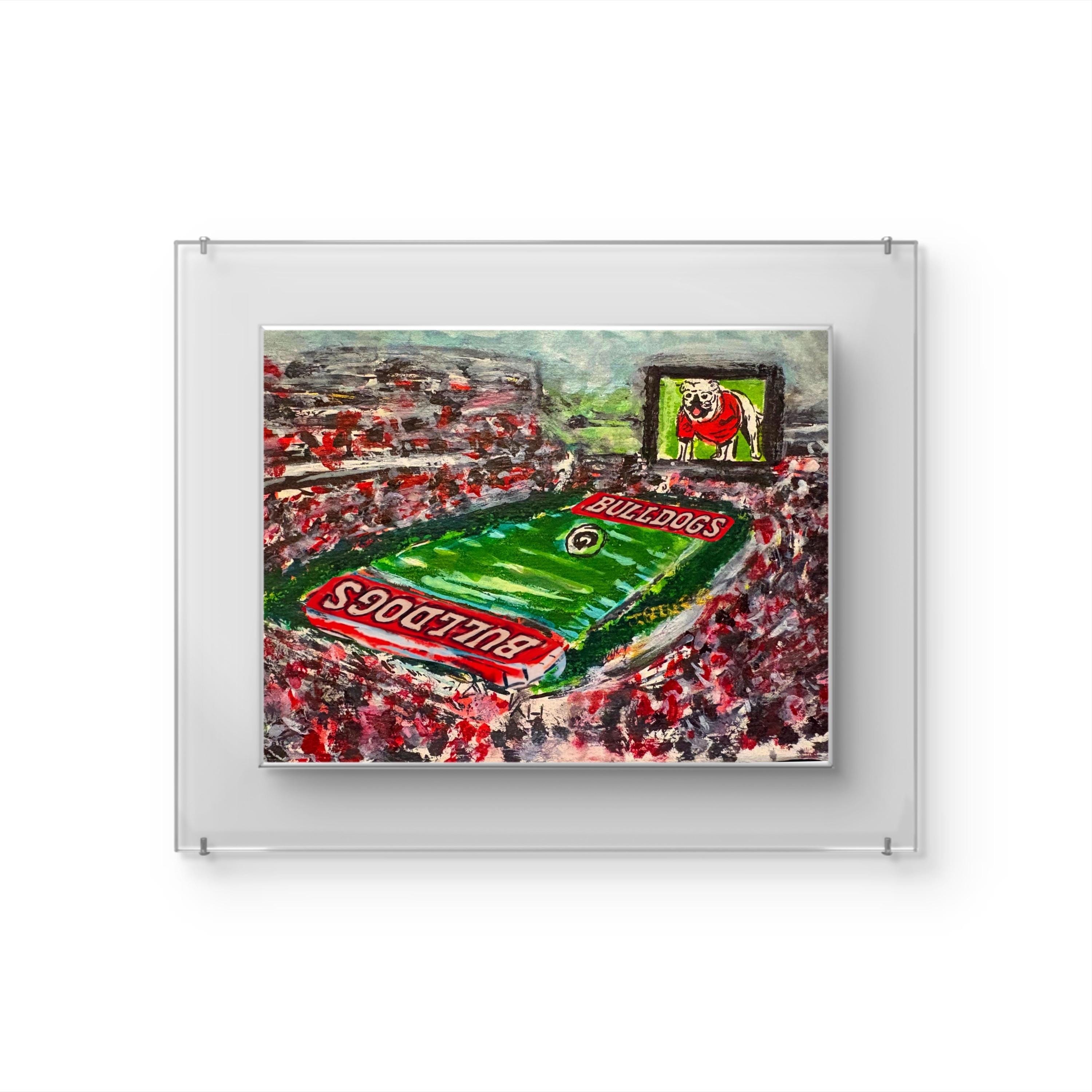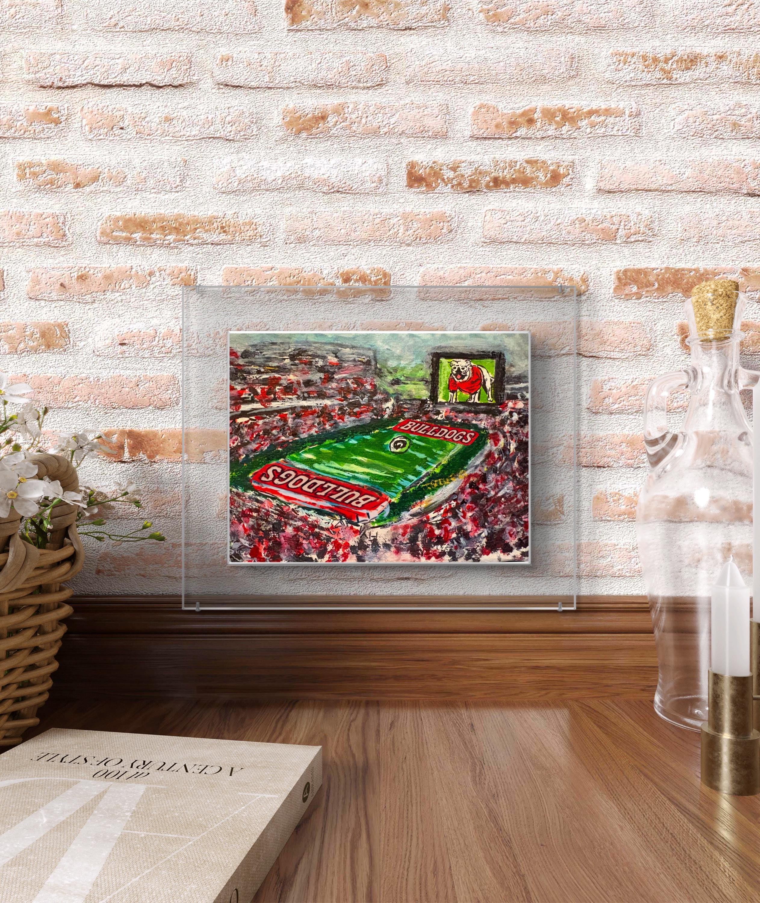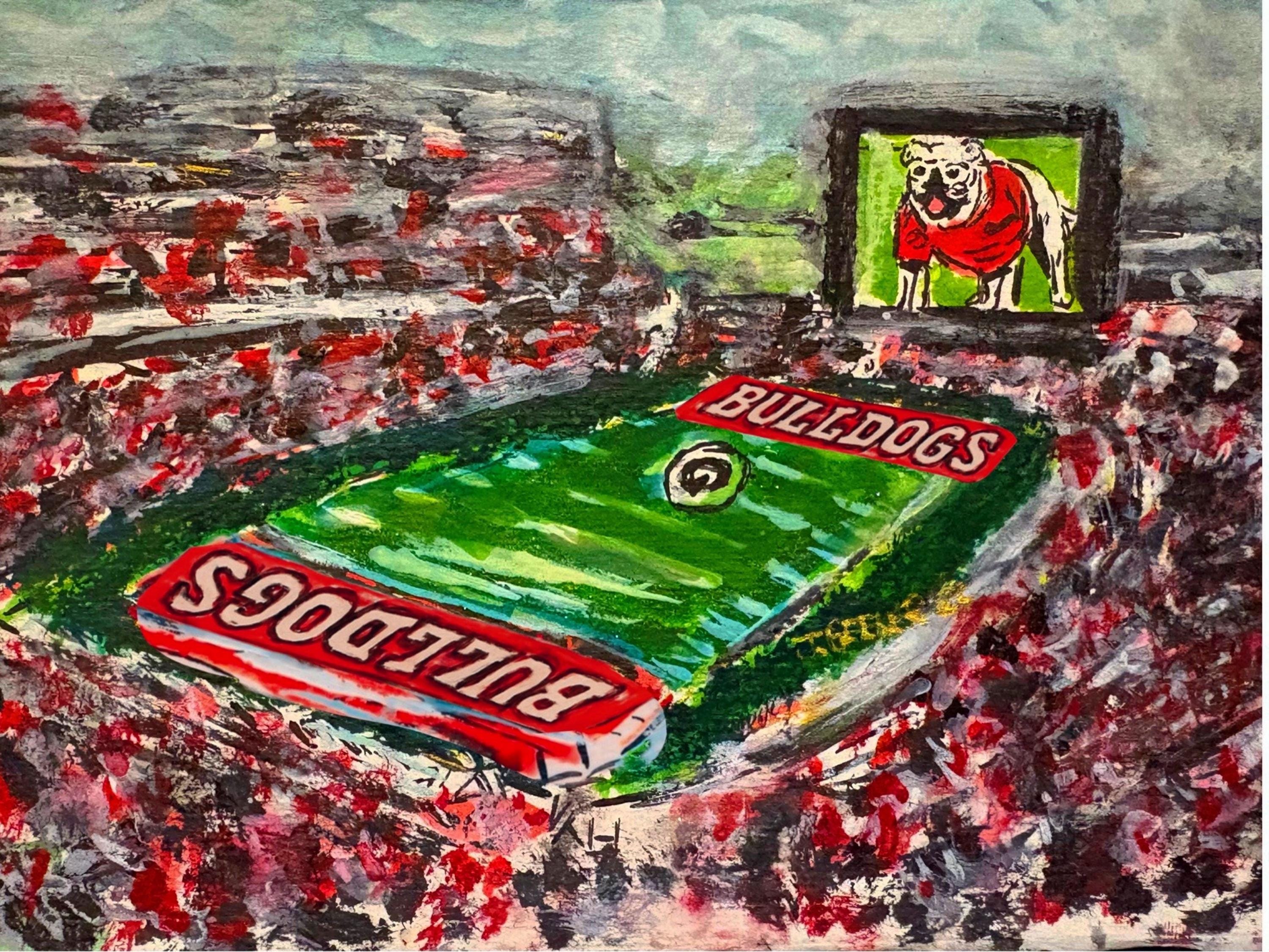 This is the "Between the Hedges" original featuring UGA, game-day, and the beauty of SEC football at the University of Georgia. This is a tribute to Georgia fans all over the world. The artwork is hand-drawn and original to Atlanta artist, Joanna Geeker Art. This stadium image shows the festive nature of SEC football, the joy of UGA game Day, and the pride and hope of a victory on Saturday's in Athens, Georgia! This is an exclusive design to Atlanta artist, Joanna Geeker; canvas and fine print options are available. Free shipping!